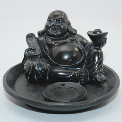 Finished in a rich, bronze-like patina this cast resin Hotei Buddha incense holder is perfect for burning coil, cone and joss incense sticks. Buddha holds and ingot which sybolizes prospertiy and is believed to bring good fortune. 3" x 2"